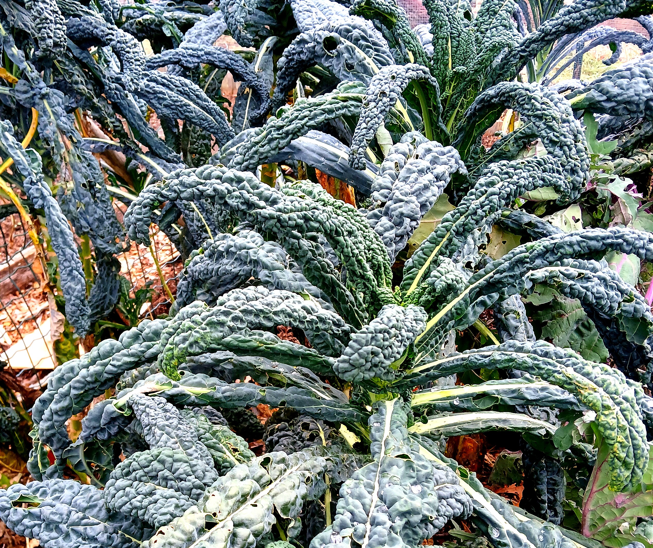 The final crop of a Massachusetts vegetable garden is often kale. This one is called “Black Magic”. It is a Lacinato or Toscano variety. We have had several frosts but it keeps on giving. Great for soups and stews: