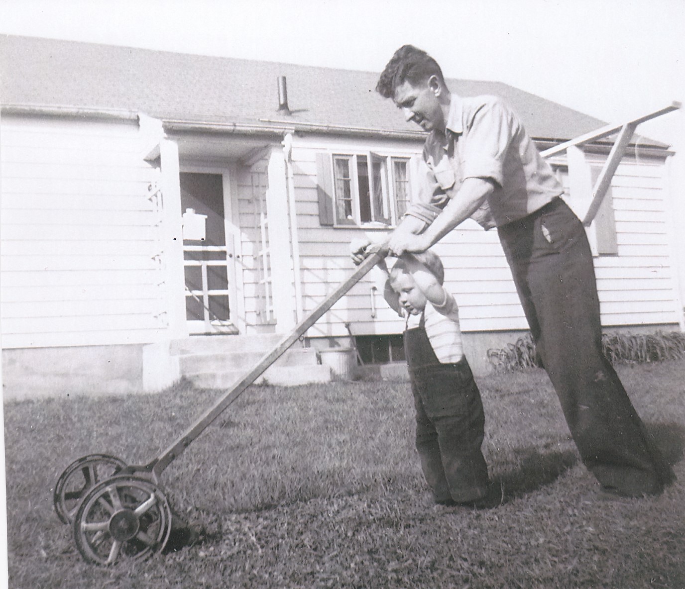 Me learning to mow. Mowing neighborhood lawns would be my first cash job.
